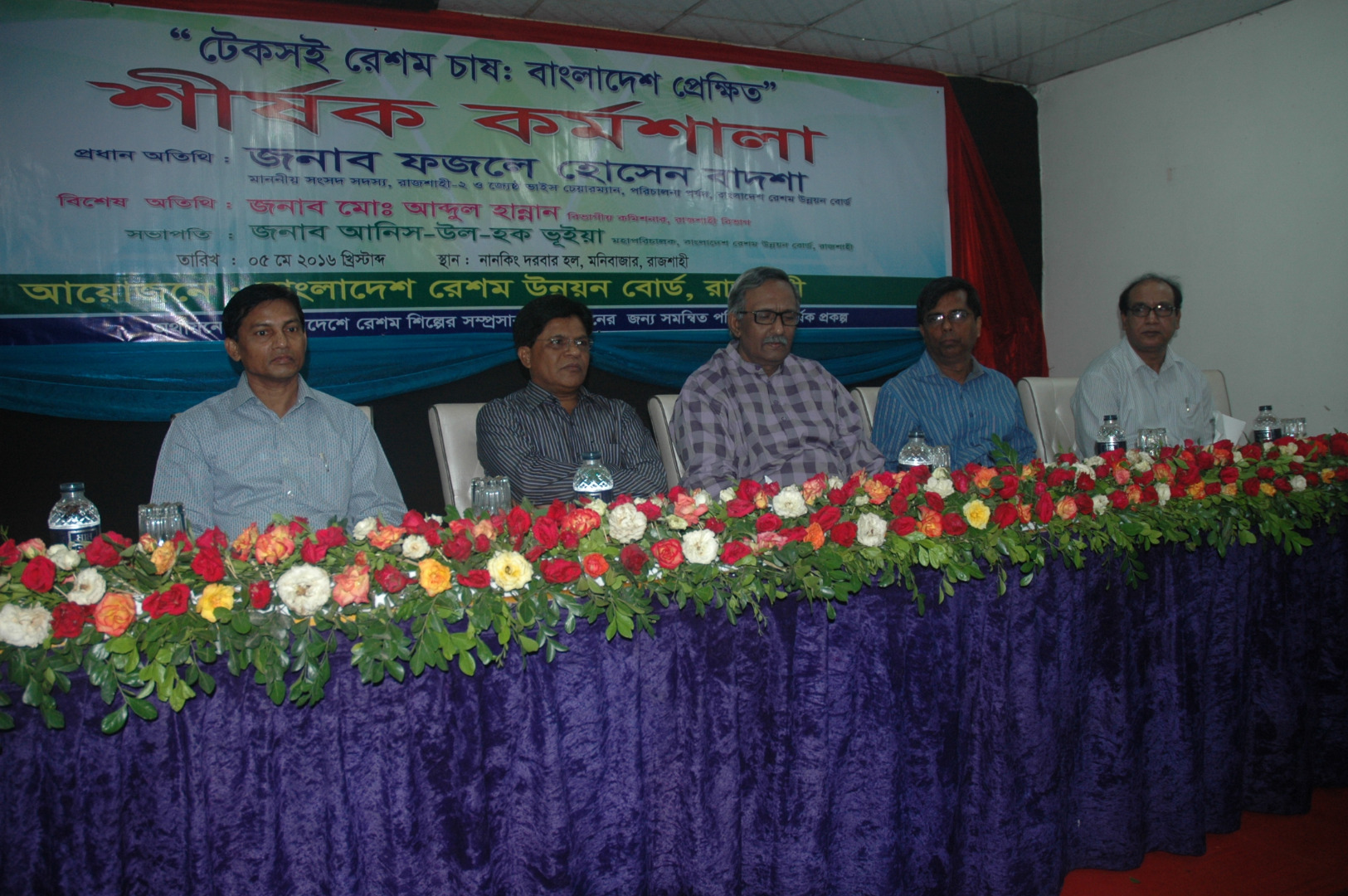 উক্ত কর্মশালায় প্রধান অতিথির বক্তব্যে রাজশাহী সদর সংসদ সদস্য জনাব ফজলে হোসেন বাদশা বলেন, তিনি বিভিন্ন সময় রেশম শিল্পকে পুনজীবিত করার লক্ষ্যে বস্ত্র ও পাট মন্ত্রনালয়ের সংসদীয় কমিটিতে আলোচনা করেছেন এবং তিনি বন্ধ কারখানা চালু করার উদ্যোগ গ্রহণ করার কথা বলেন। । তিনি বলেন, শুধুমাত্র তুঁত চাষ করলেই রেশম শিল্পের উন্নয়ন ঘটানো সম্ভব নয়। শিল্প সেক্টরে উন্নয়ন ঘটালেই এর উন্নয়ন সম্ভব হবে। তিনি কর্মশালার সুপারিশমালার আলোকে পুন আলোচনাপূর্বক একটি পূর্ণাংগ প্রস্তাব প্রস্তুত করে বাজেটের পূর্বে দেয়ার জন্য জানান । পরিশেষে সকলের ঐকান্তিক সম্মিলিত উদ্যোগে এ শিল্পের উন্নয়ন ঘটানো সম্ভব বলে জানান।